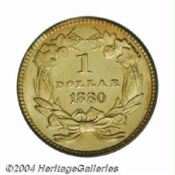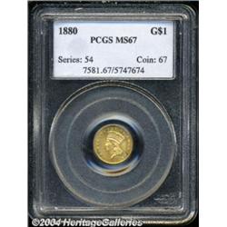 <table><tbody><tr><td><table> <TR><TD width="100%"><TABLE cellSpacing=1 cellPadding=3 width="100%" border=0><TBODY><TR><TD width="100%" bgColor=#79735c><FONT face=arial color=#ffffff size=3><B>Description</B> </FONT></TD></TR><TR><TD width="100%" bgColor=#ffffff><FONT face=arial size=2><B>1880 G$1 MS67 PCGS.</B></I> An important, low mintage issue, the business strike 1880 was produced to the extent of only 1,600 pieces. The present Superb Gem exhibits a smattering of reddish-orange color. In addition to originality, both sides boast stellar technical merits that include clean features, semi-reflective fields, and a sharp strike. </FONT></TD></TR></TBODY></TABLE></TD></TR></TBODY></TABLE><BR><A name=PricesRealized></A><TABLE cellSpacing=0 cellPadding=0 width="100%" bgColor=#000000 border=0><TBODY><TR><TD width="100%"><TABLE cellSpacing=1 cellPadding=3 width="100%" border=0><TBODY><TR><TD width="100%" bgColor=#79735c><A name=PR><FONT face=arial color=#ffffff size=3><B>Previous Prices from Heritage Auctions</B> </FONT></A></TD></TR><TR><TD bgColor=#f6f6ed><TABLE cellSpacing=0 cellPadding=0 width="100%" border=1><TBODY><TR><TD align=middle width="33%"><B>Date</B></TD><TD align=middle width="33%"><B>Service</B></TD><TD align=middle width="33%"><B>Price</B></TD></TR><TR bgColor=whitesmoke><TD width="33%"><B>07/31/2001</B></TD><TD width="33%">PCGS</TD><TD width="33%">$3,300.00</TD></TR><TR bgColor=whitesmoke><TD width="33%"><B>11/07/2003</B></TD><TD width="33%">PCGS</TD><TD width="33%">$3,910.00</TD></TR><TR bgColor=whitesmoke><TD width="33%"><B>01/11/2003</B></TD><TD width="33%">PCGS</TD><TD width="33%">$4,140.00</TD></TR><TR bgColor=whitesmoke><TD width="33%"><B>02/11/2000</B></TD><TD width="33%">PCGS</TD><TD width="33%">$5,750.00</TD></TR><TR bgColor=whitesmoke><TD width="33%"><B>05/22/1993</B></TD><TD width="33%">PCGS</TD><TD width="33%">$5,280.00</TD></TR><TR bgColor=whitesmoke><TD width="33%"><B>11/01/1999</B></TD><TD width="33%">PCGS</TD><TD width="33%">$4,675.00</TD></TR><TR bgColor=whitesmoke><TD width="33%"><B>08/01/1999</B></TD><TD width="33%">PCGS</TD><TD width="33%">$4,140.00</TD></TR><TR bgColor=whitesmoke><TD width="33%"><B>10/26/2000</B></TD><TD width="33%">NGC</TD><TD width="33%">$2,990.00</TD></TR><TR bgColor=whitesmoke><TD width="33%"><B>01/01/1996</B></TD><TD width="33%">PCGS</TD><TD width="33%">$5,280.00</TD></TR></TBODY></TABLE></TD></TR><TR><TD bgColor=#ffffff><FONT face=arial size=1 ?>PLEASE NOTE: All prices realized reflect the final hammer price PLUS the buyer's premium in auctions that charge a buyer's premium. Each item has a notation at the top of the listing indicating whether that lot included a buyer's premium. Example: A item that sells with a final hammer price of $100 and a 20% buyer's premium will display with a price realized of $120. All information listed is intended to be as accurate as possible, but errors are possible. Please use this guide carefully and inform us of any inaccuracies. </FONT></TD></TR></TBODY></TABLE></TD></TR></TBODY></TABLE><BR><TABLE cellSpacing=0 cellPadding=0 width="100%" bgColor=#000000 border=0><TBODY><TR><TD width="100%"><TABLE cellSpacing=1 cellPadding=3 width="100%" border=0><TBODY><TR><TD width="100%" bgColor=#79735c colSpan=6><FONT face=arial color=#ffffff size=3><B>Price Guide*</B> </FONT></TD></TR><TR bgColor=#f6f6ed><TD align=middle><B>Grade</B> </TD><TD align=middle><B>Coin World<BR>(Trends)</B> </TD><TD align=middle><B>Numismedia<BR>Retail</B> </TD><TD align=middle><B>Numismedia<BR>Wholesale</B> </TD><TD align=middle><B>Coin<BR>Universe</B> </TD><TD align=middle><B>Heritage<BR>Value Index</B> </TD></TR><TR bgColor=#ffffff><TD align=middle>66</TD><TD align=right>$3,500.00</TD><TD align=right>---</TD><TD align=right>$2,155.00</TD><TD align=right>$2,500.00</TD><TD align=right>$1,916.25</TD></TR><TR style="FONT-WEIGHT: bold" bgColor=#cccfdd><TD align=middle>67</TD><TD align=right>---</TD><TD align=right>---</TD><TD align=right>$3,575.00</TD><TD align=right>$4,650.00</TD><TD align=right>$3,443.00</TD></TR><TR bgColor=#ffffff><TD align=middle>68</TD><TD align=right>---</TD><TD align=right>---</TD><TD align=right>$8,375.00</TD><TD align=right>$12,500.00</TD><TD align=right>$7,375.00</TD></TR><TR bgColor=#ffffff><TD colSpan=6><FONT size=1>*All information listed is intended to be as accurate as possible, but errors are possible. No item may be returned or refused based on this information which is provided as a service to our customers. You should contact each pricing source directly to determine the accuracy of this information. </FONT></TD></TR></TBODY></TABLE></TD></TR></TBODY></TABLE><BR><TABLE cellSpacing=0 cellPadding=0 width="100%" bgColor=#000000 border=0><TBODY><TR><TD width="100%"><TABLE cellSpacing=1 cellPadding=3 width="100%" border=0><TBODY><TR><TD width="100%" bgColor=#79735c><FONT face=arial color=#ffffff size=3><B>Population Guide</B> </FONT></TD></TR><TR bgColor=#ffffff><TD align=middle><!-- Begin Output of Population Grid--><TABLE cellSpacing=0 cellPadding=0 width="100%" border=0><TBODY><TR><TD vAlign=center><TABLE cellSpacing=0 width="100%" border=1 cellsadding="3"><TBODY><TR><TD vAlign=center><TABLE cellSpacing=0 cellPadding=3 width="100%" border=1><TBODY><TR><TD vAlign=center align=middle bgColor=#f0f1e8 colSpan=2 <CENTER><FONT face=Arial size=2><B>PCGS Pop </B></FONT><CENTER></CENTER></TD><TD vAlign=center align=middle bgColor=#f0f1e8 colSpan=2><CENTER><FONT face=Arial size=2><B>NGC Pop</B></CENTER></FONT></TD></TR><TR><TD vAlign=center><FONT face=Arial size=2>(67)</FONT> </TD><TD vAlign=center align=right><FONT face=Arial size=2>93</FONT> </TD><TD vAlign=center><FONT face=Arial size=2>(67)</FONT> </TD><TD vAlign=center align=right><FONT face=Arial size=2>59</FONT> </TD></TR><TR><TD vAlign=center><FONT face=Arial size=2>(>67)</FONT> </TD><TD vAlign=center align=right><FONT face=Arial size=2>19</FONT> </TD><TD vAlign=center><FONT face=Arial size=2>(>67)</FONT> </TD><TD vAlign=center align=right><FONT face=