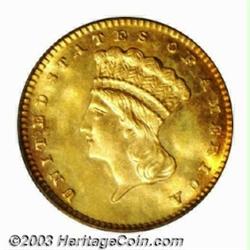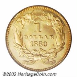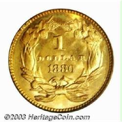 <TABLE cellSpacing=0 cellPadding=0 width="100%" bgColor=#000000 border=0><TBODY><TR><TD width="100%"><TABLE cellSpacing=1 cellPadding=3 width="100%" border=0><TBODY><TR><TD width="100%" bgColor=#79735c><FONT face=arial color=#ffffff size=3><B>Description</B> </FONT></TD></TR><TR><TD width="100%" bgColor=#ffffff><FONT face=arial size=2><B>1880 G$1 MS67 PCGS.</B></I> With an original mintage of just 1,600 business strikes, the 1880 gold dollar is a desirable low-mintage issue in any state of preservation. However, since these small gold coins did not circulate much in their later years of production and were often saved by contemporary collectors, high grade specimens are occasionally available to appreciative modern day enthusiast. This stunning Superb Gem example displays swirling orange-gold luster with flashy surfaces that reveal no visual imperfections to the naked eye. Well struck on both sides, and ideal for a high grade type set or for a high grade specialized set of gold dollars. Population: 79 in 67, 19 finer (4/03). </FONT></TD></TR></TBODY></TABLE></TD></TR></TBODY></TABLE><BR><A name=PricesRealized></A><TABLE cellSpacing=0 cellPadding=0 width="100%" bgColor=#000000 border=0><TBODY><TR><TD width="100%"><TABLE cellSpacing=1 cellPadding=3 width="100%" border=0><TBODY><TR><TD width="100%" bgColor=#79735c><A name=PR><FONT face=arial color=#ffffff size=3><B>Previous Prices from Heritage Auctions</B> </FONT></A></TD></TR><TR><TD bgColor=#f6f6ed><TABLE cellSpacing=0 cellPadding=0 width="100%" border=1><TBODY><TR><TD align=middle width="33%"><B>Date</B></TD><TD align=middle width="33%"><B>Service</B></TD><TD align=middle width="33%"><B>Price</B></TD></TR><TR bgColor=whitesmoke><TD width="33%"><B>03/04/1995</B></TD><TD width="33%">PCGS</TD><TD width="33%">$4,400.00</TD></TR><TR bgColor=whitesmoke><TD width="33%"><B>05/22/1993</B></TD><TD width="33%">PCGS</TD><TD width="33%">$5,280.00</TD></TR><TR bgColor=whitesmoke><TD width="33%"><B>08/01/1995</B></TD><TD width="33%">PCGS</TD><TD width="33%">$5,775.00</TD></TR><TR bgColor=whitesmoke><TD width="33%"><B>01/11/2003</B></TD><TD width="33%">PCGS</TD><TD width="33%">$4,140.00</TD></TR><TR bgColor=whitesmoke><TD width="33%"><B>02/01/1999</B></TD><TD width="33%">PCGS</TD><TD width="33%">$4,290.00</TD></TR><TR bgColor=whitesmoke><TD width="33%"><B>01/01/2001</B></TD><TD width="33%">PCGS</TD><TD width="33%">$2,990.00</TD></TR><TR bgColor=whitesmoke><TD width="33%"><B>10/26/2000</B></TD><TD width="33%">NGC</TD><TD width="33%">$2,990.00</TD></TR></TBODY></TABLE></TD></TR><TR><TD bgColor=#ffffff><FONT face=arial size=1 ?>PLEASE NOTE: All prices realized reflect the final hammer price PLUS the buyer's premium in auctions that charge a buyer's premium. Each item has a notation at the top of the listing indicating whether that lot included a buyer's premium. Example: A item that sells with a final hammer price of $100 and a 20% buyer's premium will display with a price realized of $120. All information listed is intended to be as accurate as possible, but errors are possible. Please use this guide carefully and inform us of any inaccuracies. </FONT></TD></TR></TBODY></TABLE></TD></TR></TBODY></TABLE><BR><TABLE cellSpacing=0 cellPadding=0 width="100%" bgColor=#000000 border=0><TBODY><TR><TD width="100%"><TABLE cellSpacing=1 cellPadding=3 width="100%" border=0><TBODY><TR><TD width="100%" bgColor=#79735c colSpan=6><FONT face=arial color=#ffffff size=3><B>Price Guide*</B> </FONT></TD></TR><TR bgColor=#f6f6ed><TD align=middle><B>Grade</B> </TD><TD align=middle><B>Coin World<BR>(Trends)</B> </TD><TD align=middle><B>Numismedia<BR>Retail</B> </TD><TD align=middle><B>Numismedia<BR>Wholesale</B> </TD><TD align=middle><B>Coin<BR>Universe</B> </TD><TD align=middle><B>Heritage<BR>Value Index</B> </TD></TR><TR bgColor=#ffffff><TD align=middle>66</TD><TD align=right>$3,150.00</TD><TD align=right>---</TD><TD align=right>$2,155.00</TD><TD align=right>$2,450.00</TD><TD align=right>$1,846.25</TD></TR><TR style="FONT-WEIGHT: bold" bgColor=#cccfdd><TD align=middle>67</TD><TD align=right>---</TD><TD align=right>---</TD><TD align=right>$3,575.00</TD><TD align=right>$4,650.00</TD><TD align=right>$3,443.00</TD></TR><TR bgColor=#ffffff><TD align=middle>68</TD><TD align=right>---</TD><TD align=right>---</TD><TD align=right>$8,375.00</TD><TD align=right>$12,500.00</TD><TD align=right>$7,375.00</TD></TR><TR bgColor=#ffffff><TD colSpan=6><FONT size=1>*All information listed is intended to be as accurate as possible, but errors are possible. No item may be returned or refused based on this information which is provided as a service to our customers. You should contact each pricing source directly to determine the accuracy of this information. </FONT></TD></TR></TBODY></TABLE></TD></TR></TBODY></TABLE><BR><TABLE cellSpacing=0 cellPadding=0 width="100%" bgColor=#000000 border=0><TBODY><TR><TD width="100%"><TABLE cellSpacing=1 cellPadding=3 width="100%" border=0><TBODY><TR><TD width="100%" bgColor=#79735c><FONT face=arial color=#ffffff size=3><B>Population Guide</B> </FONT></TD></TR><TR bgColor=#ffffff><TD align=middle><!-- Begin Output of Population Grid--><TABLE cellSpacing=0 cellPadding=0 width="100%" border=0><TBODY><TR><TD vAlign=center><TABLE cellSpacing=0 width="100%" border=1 cellsadding="3"><TBODY><TR><TD vAlign=center><TABLE cellSpacing=0 cellPadding=3 width="100%" border=1><TBODY><TR><TD vAlign=center align=middle bgColor=#f0f1e8 colSpan=2 <CENTER><FONT face=Arial size=2><B>PCGS Pop </B></FONT><CENTER></CENTER></TD><TD vAlign=center align=middle bgColor=#f0f1e8 colSpan=2><CENTER><FONT face=Arial size=2><B>NGC Pop</B></CENTER></FONT></TD></TR><TR><TD vAlign=center><FONT face=Arial size=2>(67)</FONT> </TD><TD vAlign=center align=right><FONT face=Arial size=2>79</FONT> </TD><TD vAlign=center><FONT face=Arial size=2>(67)</FONT> </TD><TD vAlign=center align=right><FONT face=Arial size=2>54</FONT> </TD></TR><TR><TD vAlign=center><FONT face=Arial size=2>(>67)</FONT> </TD><TD vAlig
