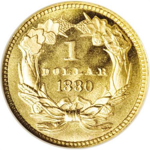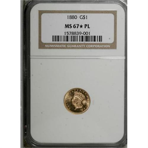 <B>1880 G$1 MS67 Prooflike NGC.</B></I> Intense mint frost illuminates the sparkling, essentially pristine surfaces of this beautiful example. The design elements are crisply defined, and both sides of the piece are free of die clash marks. The tiny mintage of 1,600 business strikes ensures the ongoing scarcity of this gold dollar issue, and Prooflike Superb Gems are rare. Census: 11 in 67 Prooflike, 1 finer (9/07). <BR><BR><B>Coin Engraver:</B> James B. Longacre<BR><BR><b>Shipping:</b> Coins & Currency (<a target="_blank" href="http://www.heritageauctions.com/common/shipping.php">view shipping information</a>)