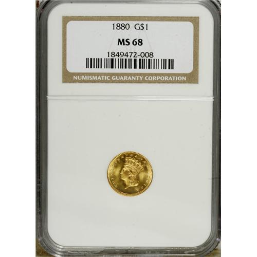 <B>1880 G$1 MS68 NGC.</B></I> The 1880 gold dollar has a high survival rate. Of an original mintage of just 1,600 business strikes, NGC and PCGS have certified about 600 examples, the vast majority of which are in Mint State. The MS68 coin in this lot is among the more scarce survivors. Its virtually flawless brass-gold surfaces radiate fantastic luster, and the design elements are powerfully impressed. Tilting the piece just slightly beneath a light source reveals impressive field-motif contrast. Census: 22 in 68, 0 finer (1/07).<BR><BR><b>Shipping:</b> Coins & Currency (<a target="_blank" href="http://www.heritageauctions.com/common/shipping.php">view shipping information</a>)