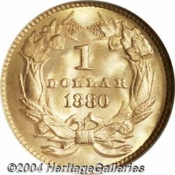 <table><tr><td><table><tr><td>1880 G$1 MS68 NGC. The Philadelphia Mint produced just 1,600 business strikes and 36 proof Gold Dollars in 1880. This is an understandably popular date, but, since this issue did not see widespread circulation, the 1880 is actually one of the more common Type Three Gold Dollars at the Gem level of preservation. Coins that grade as fine as MS67 are also relatively available, but the present Superb Gem is one of only 13 examples graded MS68 by NGC, and there are none finer (3/04). This is a lovely specimen with sharp striking definition and rich, billowy mint frost. Modest, yet appreciable cartwheel effects are seen as the coin turns beneath the light, and the color is a beautiful honey-gold shade. There are, of course, there are no abrasions of note. <BR><BR><B>Important notice:</B> Heritage usually auctions material at the rate of 200-250 lots per hour. On some occasions eBay Live bid software or the Internet may not be able to keep up with the pace of the auction. We recommend placing a realistic absentee bid now as insurance to avoid disappointment. Occasionally the auctioneer may eliminate or reject an eBay Live bid, and the auctioneer may also reopen a lot after the close of the eBay live bidding (usually because we missed an audience bid), and may reject your bid even if it shows you as the winning bidder. By bidding via eBay Live, you agree that Heritage may award the lot to another bidder at its sole discretion under the circumstances described above or any other reasonable circumstances. Since eBay bids are not shown to us until we open the lot on the floor, we treat those bids just like floor bids. In most cases the floor responds before the eBay bid is presented to us, due to Internet lag time, so for consistency we have made it a policy that floor bids are always considered first over tie eBay live bids. Also please note that all Heritage lots purchased through eBay Live carry a 20% Buyer's Premium. Please make sure you read the Terms and Conditions before you bid. <BR><BR><B>IMPORTANT ANNOUNCEMENT ABOUT RESERVES:</B> Heritage now divulges all reserves on its web site 7 days before every auction. If you want to know whether the reserve on this lot has been met, and if not, what the reserve amount is, please visit this lot page on the HeritageCoin.com web site, or email: bid@HeritageGalleries.com </span></font></td></tr></table></td></tr></table>