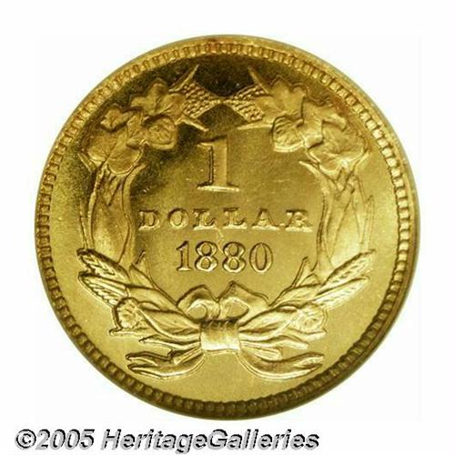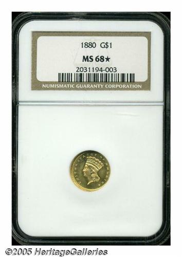 <B>1880<G$1> MS68 <S NGC.</B></I> Although NGC has certified 17 examples of this date as MS68, this is the only one that has received the star designation, thus it is the single finest example of the date certified by the Florida grading service. Just 1,600 business strikes and 36 Proofs were coined during the year, and this was several years before the large Proof production of the late 1880s. While few of the business strikes actually circulated, nearly all survivors are in the middle Mint State grades from MS64 through MS66. NGC has certified 181 coins in that grade range, with 34 lower grade pieces and the 17 MS68 examples already mentioned. This sensational example has satiny gold luster in the fields, with frosty and lustrous devices. Light cameo contrast on both sides adds to the exceptional eye appeal. This is a lovely example that will please the connoisseur.
