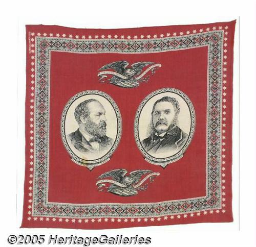 <B>1880 Garfield and Arthur Jugate Campaign Bandana</B></I> An interesting textile campaign item in that both candidates shown in the large oval portraits were to be President within about a year of its manufacture by S. H. Greene & Sons of Washington. A decorative red, white and black border surrounds the portraits of Gen. James A. Garfield and Gen. Chester A. Arthur, with eagle on shield graphics that proclaim "The Union and the Constitution Forever" inside a banner. Choice condition save for a couple of minor light areas of discoloration. Bandana size is 20.5" x 19.5", matted and framed to an overall size of 27.5" x 27.5". Lot:259