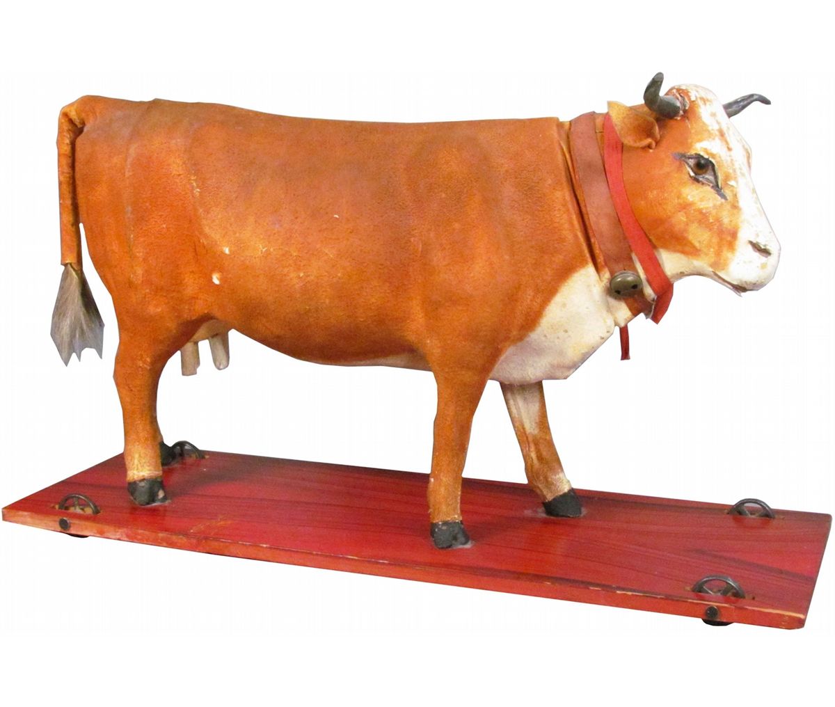 1880 German "Cow" Pull Toy. Pewter wheels on original stenciled base. Head moves up and down. Excellent original condition. Cow measures 18 X 10 X 5 inches.