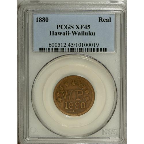 <B>1880 Hawaii Wailuku Plantation Real Token XF45 PCGS.</B></I> Medcalf 2TE-6. According to Donald Medcalf and Ronald Russell in their 1991 reference <I>Hawaiian Money,</B></I> The First Wailuku Sugar Co. employed 160 men and produced 1,600 tons of cane sugar in 1880. 1 Real and Half Real tokens were issued to laborers, these were struck from copper by a plantation blacksmith. Sharply struck for the issue, and essentially void of verdigris, unlike most pieces encountered. Listed on page 376 of the 2007 <I>Guide Book.</B></I><BR><BR><b>Shipping:</b> Coin/Currency (<a target="_blank" href="http://www.heritageauctions.com/common/shipping.php">view shipping information</a>)