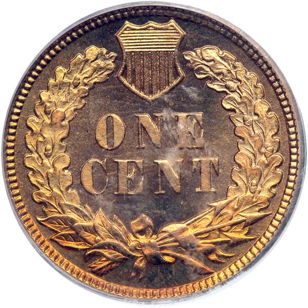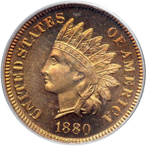 1880 Indian Head Cent. PCGS graded Proof 65 Red. Lovely warm golden mint red colors. In the new PCGS shield plus holder. A blazing red gem of the finest order for its class. Intense mirror-smooth luster fairly leaps from the surfaces of this prize. One look at the present frosted gem will satisfy your curiosity as to why few examples of the date has been certified finer than the present coin. One would be hard put to find a more truly beautiful gem specimen of a popular Indian cent with not even a smidgen of softness on the hair or feathers, the shield or wreath. Pop 61; 15 in PR-66 RD; 8 in PR-67 RD (PCGS # 2329) .