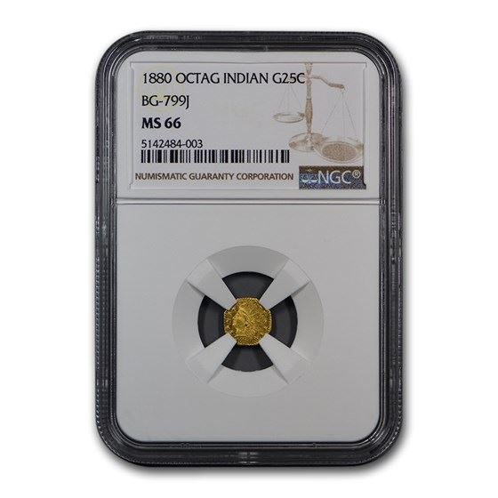 One piece 1880 Indian Octagonal 25 Cent Gold MS-66 NGC (BG-799j)