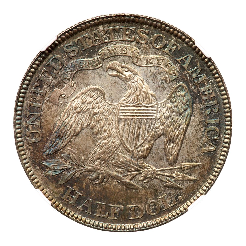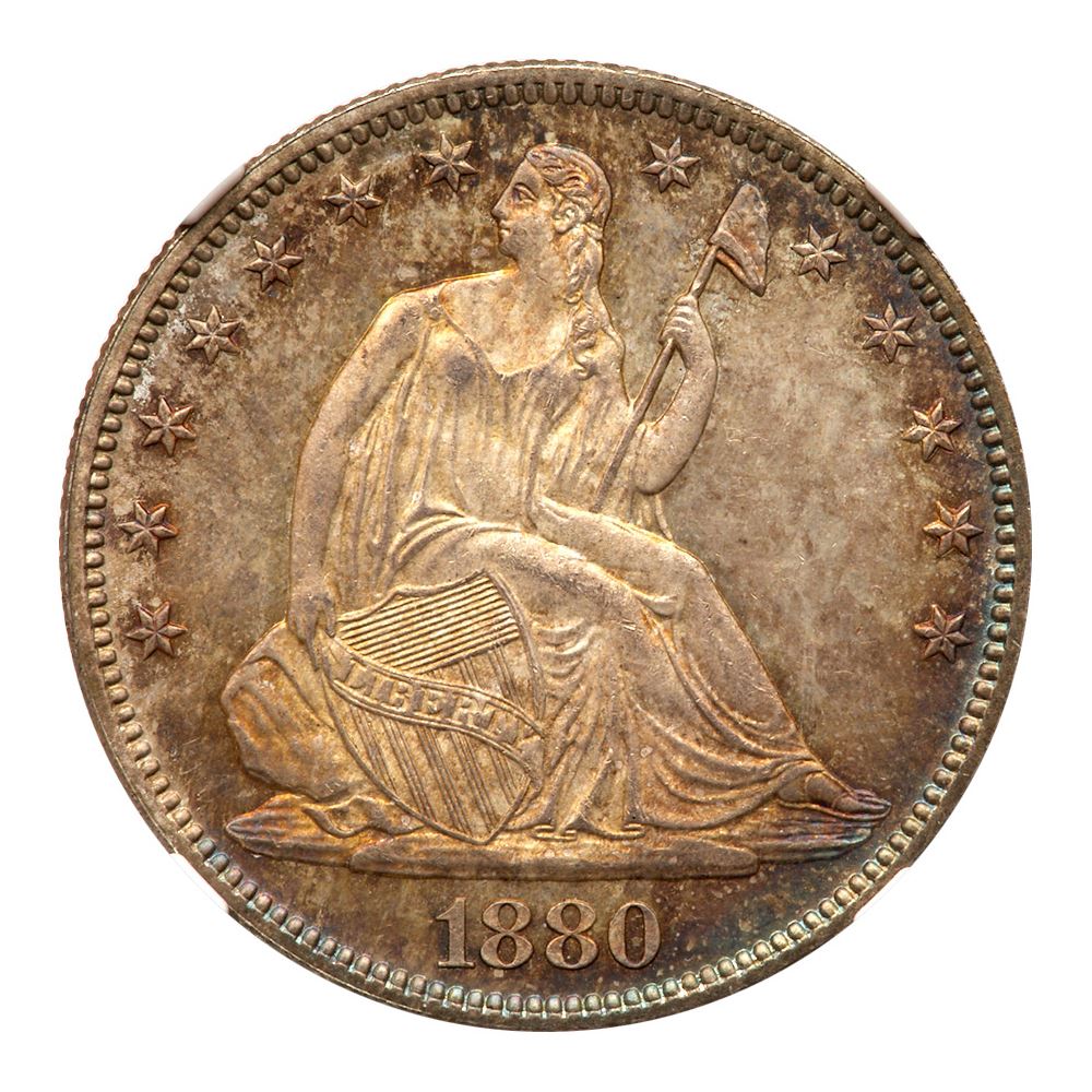 1880. NGC graded MS-67. This is one of those extremely low mintage dates from an era when silver coins were not generally circulating up until 1879. All silver and especially gold coins were hoarded through the beginnings of the Civil War 1861. As the war became unexpectedly long lasting, President Lincoln issued Greenbacks or unbacked gold paper money which circulated, and these helped pay for the onerous costs of the War. However, if you wanted gold or silver coins, you had to pay over the greenback or par price to get real metal coins. These gold and silver coins were often needed for international purchases. The greenbacks inflated well below the value of gold and silver through the war. After hostilities ceased the greenbacks were still dominate in circulation but ever so slowly the premium of gold/silver to paper began to shrink. By 1879 the paper price and gold price were at last the same, so coins from long hidden hoards came back into circulation. So many coins in fact, that no new coins were needed! Hence many tiny mintages of these Half Dollars in the 1880s. Enough were struck to keep the coining presses lubricated, but just barely. Here is one of these historic relics that was somehow carefully preserved in Superb condition from 1880 forward and today stands as one of the abolute finest seen from a meager mintage of a mere 8,400 pieces. Well struck. Wonderful rainbow toning on both sides.Pop 6; none finer at NGC. Estimated Value 7,500 - UP