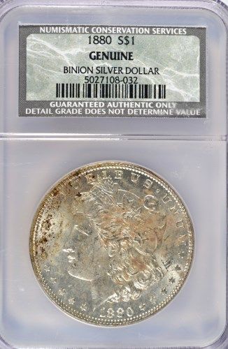 1880 MORGAN DOLLAR "BINION SILVER DOLLAR" NGC GENUINE, GRADES MS63, TONED