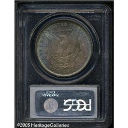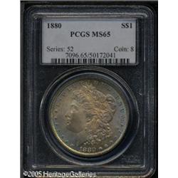 <B>1880<img border='0' src='http://www.heritagecoins.com/images/star.gif' width=10 height=10>$1 MS65 PCGS.</B></I> Multicolored toning bathes lustrous surfaces over each side. Well struck, and no mentionable marks to report. Lot:9957