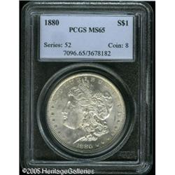 <B>1880<img border='0' src='http://www.heritagecoins.com/images/star.gif' width=10 height=10>$1 MS65 PCGS.</B></I> Well struck and fully lustrous, with swirling cartwheel brilliance appearing on both sides. Carefully preserved and minimally abraded throughout. Lot:9958