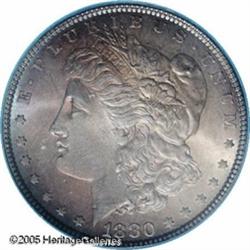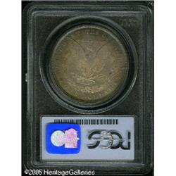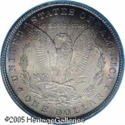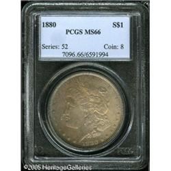 <B>1880<img border='0' src='http://www.heritagecoins.com/images/star.gif' width=10 height=10>$1 MS66 PCGS.</B></I> Deep golden-brown, russet, pewter-gray, and iridescent violet toning covers the surfaces of this well struck Gem. No distracting abrasions are present, and the luster is complete and shines through the dense toning. Only one coin has been certified in a higher grade (by NGC). This lovely Morgan would be right at home in the finest set of silver dollars.<BR><I>From The Banks Collection.</B></I> Lot:9960