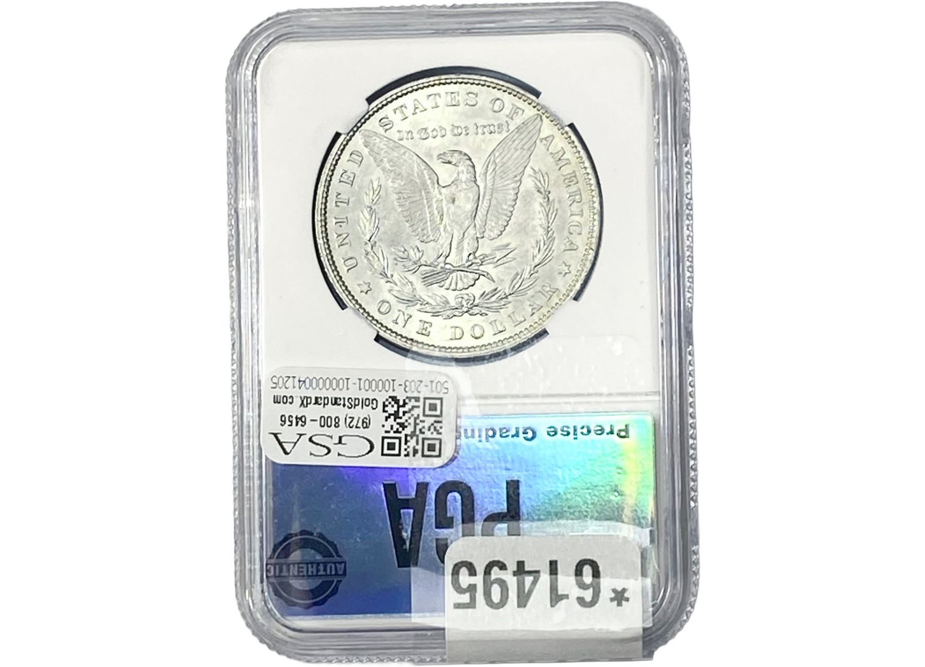 e. Coins sold referencing a third-party grading service are sold “AS IS” without any express or implied warranty, except for a guarantee by GSA that they are genuine. Removal or alteration of the holder, voids all of Bidder’s claims concerning that Product. Certain warranties may be available from the grading services and Bidders are referred to them for further details: Numismatic Guaranty Corporation (NGC), PO Box 4776, Sarasota, FL 34230, www.ngccoin.com/services/writtenguarantee.asp; Professional Coin Grading Services (PCGS), PO Box 9458, Newport Beach, CA 92658, www.pcgs.com/guarantee.html; ANACS, 6555 S. Kenton St., Ste. 303, Englewood, CO 80111; and Independent Coin Grading Co. (ICG), 7901 East Bellview, Ave., Suite 50, Englewood, CO 80111.
