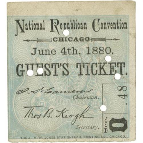 <B>1880 Chicago National Republican Convention Guest's Ticket</B></I> measuring 2.5" x 2.75", printed by the J. M. W. Jones Stationery and Printing Company, Chicago, dated June 4, 1880, with four punch holes, in very good condition.<BR><BR><b>Shipping:</b> Small Flat (<a target="_blank" href="http://www.heritageauctions.com/common/shipping.php">view shipping information</a>)