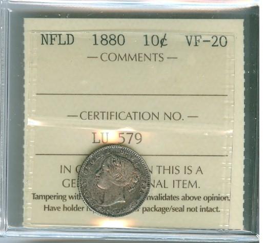 1880 Nfld 10¢ ICCS VF20, lightly toned.