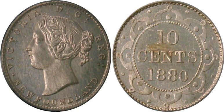 1880 Nfld 10¢ PCGS SP64. Full white with frostlike finish. Excessively scarce and desirable