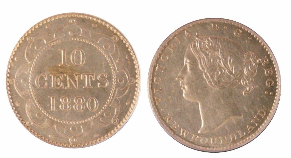 1880 Nfld 10¢ PCGS SP64. Full white with frostlike finish. Rare!