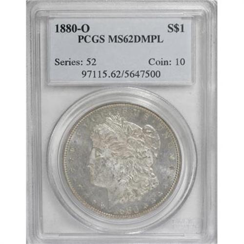 <B>1880-O $1 MS62 Deep Mirror Prooflike PCGS.</B></I> PCGS Population (39/84). NGC Census: (31/86). Numismedia Wsl. Price for NGC/PCGS coin in MS62: $775. (#97115)<BR><I>From The Diamond Head Collection.</B></I><BR><BR><b>Shipping:</b> Coins & Currency (<a target="_blank" href="http://www.heritageauctions.com/common/shipping.php">view shipping information</a>)