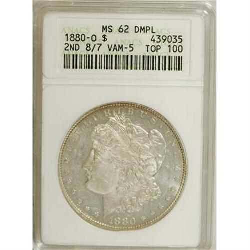 <B>1880-O $1 Second 8/7 MS62 Deep Mirror Prooflike ANACS.</B></I> VAM-5. A Top 100 Variety. Medium O. This nicely mirrored New Orleans dollar is brilliant save for a hint of peach toning near the rims. Considered scarcer than VAM-4, which has similar die fill within the upper loop of the second 8.<BR><BR><b>Shipping:</b> Coins & Currency (<a target="_blank" href="http://www.heritageauctions.com/common/shipping.php">view shipping information</a>)