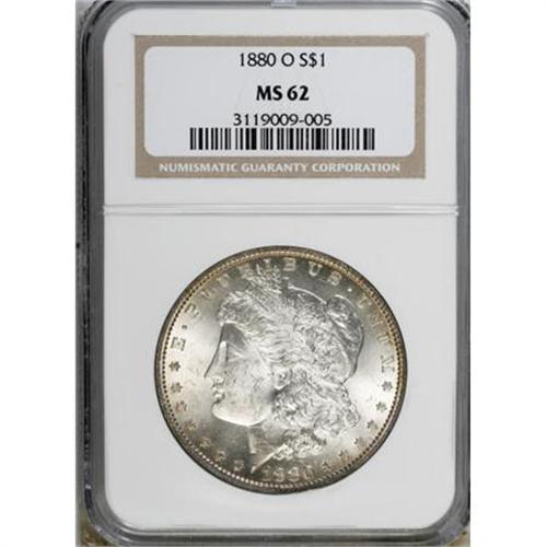 <B>1880-O $1 MS62 NGC.</B></I> NGC Census: (1325/2377). PCGS Population (1819/2838). Mintage: 5,305,000. Numismedia Wsl. Price for NGC/PCGS coin in MS62: $96. (#7114)<BR><BR><B>Coin Engraver:</B> George T. Morgan<BR><BR><b>Shipping:</b> Coins & Currency (<a target="_blank" href="http://www.heritageauctions.com/common/shipping.php">view shipping information</a>)
