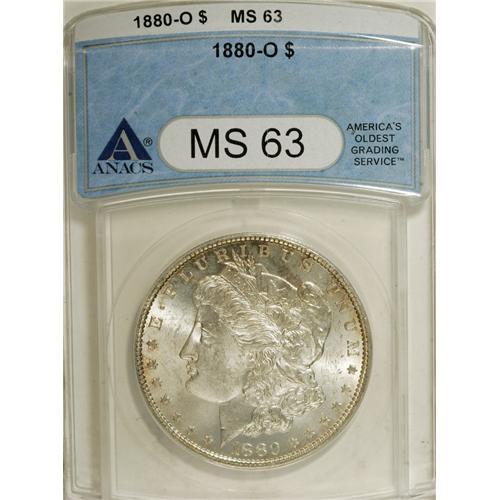 <B>1880-O $1 MS63 ANACS.</B></I> NGC Census: (1459/821). PCGS Population (1762/951). Mintage: 5,305,000. Numismedia Wsl. Price: $300. (#7114)<BR><BR><b>Shipping:</b> Coins & Currency (<a target="_blank" href="http://www.heritageauctions.com/common/shipping.php">view shipping information</a>)