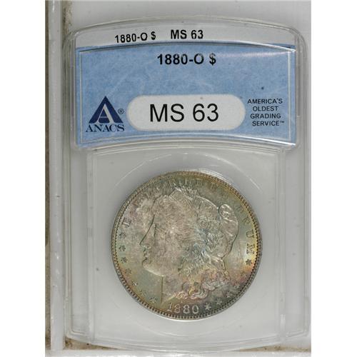 <B>1880-O $1 MS63 ANACS.</B></I> NGC Census: (1465/827). PCGS Population (1746/941). Mintage: 5,305,000. Numismedia Wsl. Price for NGC/PCGS coin in MS63: $300. (#7114)<BR><BR><b>Shipping:</b> Coins & Currency (<a target="_blank" href="http://www.heritageauctions.com/common/shipping.php">view shipping information</a>)