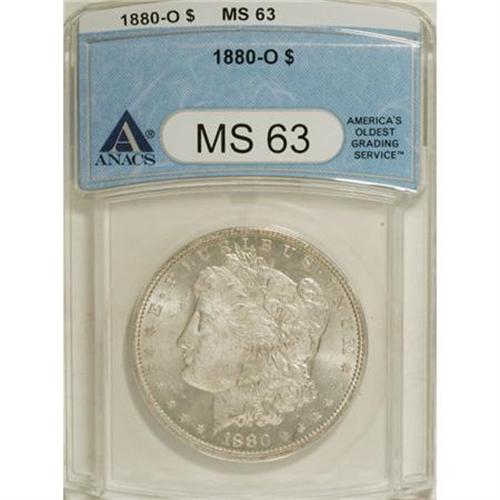 <B>1880-O $1 MS63 ANACS.</B></I> NGC Census: (1473/829). PCGS Population (1749/941). Mintage: 5,305,000. Numismedia Wsl. Price for NGC/PCGS coin in MS63: $300. (#7114)<BR><BR><b>Shipping:</b> Coins & Currency (<a target="_blank" href="http://www.heritageauctions.com/common/shipping.php">view shipping information</a>)