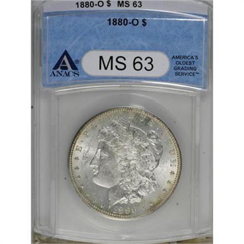 <B>1880-O $1 MS63 ANACS.</B></I> NGC Census: (1521/865). PCGS Population (1862/1041). Mintage: 5,305,000. Numismedia Wsl. Price for NGC/PCGS coin in MS63: $325. (#7114)<BR><BR><B>Coin Engraver:</B> George T. Morgan<BR><BR><b>Shipping:</b> Coins & Currency (<a target="_blank" href="http://www.heritageauctions.com/common/shipping.php">view shipping information</a>)