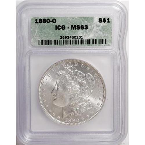 <B>1880-O $1 MS63 ICG.</B></I> NGC Census: (1515/849). PCGS Population (1823/997). Mintage: 5,305,000. Numismedia Wsl. Price for NGC/PCGS coin in MS63: $300. (#7114)<BR><BR><B>Coin Engraver:</B> George T. Morgan<BR><BR><b>Shipping:</b> Coins & Currency (<a target="_blank" href="http://www.heritageauctions.com/common/shipping.php">view shipping information</a>)