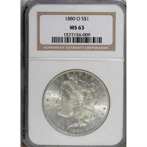 <B>1880-O $1 MS63 NGC.</B></I> NGC Census: (1494/842). PCGS Population (1768/963). Mintage: 5,305,000. Numismedia Wsl. Price for NGC/PCGS coin in MS63: $300. (#7114)<BR><BR><B>Coin Engraver:</B> George T. Morgan<BR><BR><b>Shipping:</b> Coins & Currency (<a target="_blank" href="http://www.heritageauctions.com/common/shipping.php">view shipping information</a>)