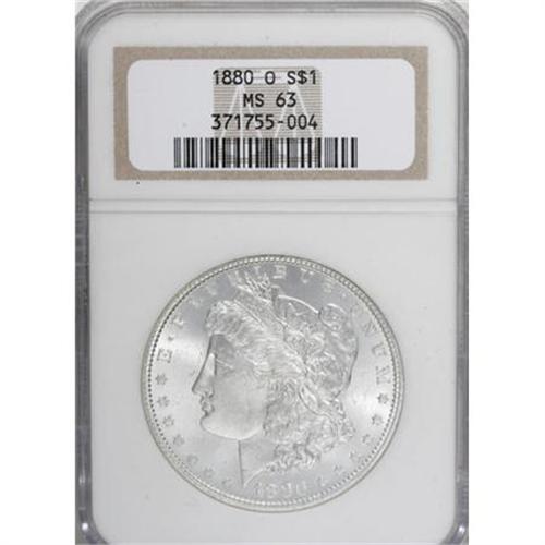 <B>1880-O $1 MS63 NGC.</B></I> . NGC Census: (1525/865). PCGS Population (1849/1019). Mintage: 5,305,000. Numismedia Wsl. Price for NGC/PCGS coin in MS63: $325. (#7114)<BR><BR><B>Coin Engraver:</B> George T. Morgan<BR><BR><b>Shipping:</b> Coins & Currency (<a target="_blank" href="http://www.heritageauctions.com/common/shipping.php">view shipping information</a>)