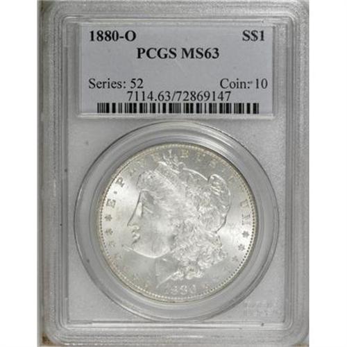 <B>1880-O $1 MS63 PCGS.</B></I> PCGS Population (1749/941). NGC Census: (1478/832). Mintage: 5,305,000. Numismedia Wsl. Price for NGC/PCGS coin in MS63: $300. (#7114)<BR><BR><b>Shipping:</b> Coins & Currency (<a target="_blank" href="http://www.heritageauctions.com/common/shipping.php">view shipping information</a>)