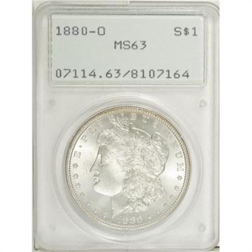 <B>1880-O $1 MS63 PCGS.</B></I> PCGS Population (1749/941). NGC Census: (1478/832). Mintage: 5,305,000. Numismedia Wsl. Price for NGC/PCGS coin in MS63: $300. (#7114)<BR><BR><B>Coin Engraver:</B> George T. Morgan<BR><BR><b>Shipping:</b> Coins & Currency (<a target="_blank" href="http://www.heritageauctions.com/common/shipping.php">view shipping information</a>\)