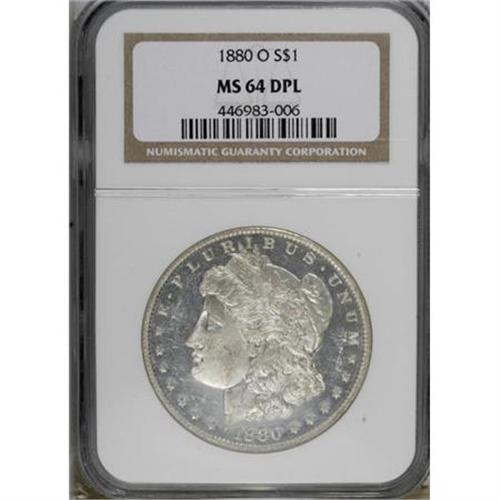 <B>1880-O $1 MS64 Deep Mirror Prooflike NGC.</B></I> Micro O. Mirrored fields and frosty devices proclaim the quality of this exactingly struck and lightly toned near-Gem. The reverse is splendidly smooth, and the obverse lacks individually mentionable marks. Census: 38 in 64 Deep Mirror Prooflike, 0 finer (1/08).<BR><BR><b>Shipping:</b> Coins & Currency (<a target="_blank" href="http://www.heritageauctions.com/common/shipping.php">view shipping information</a>)