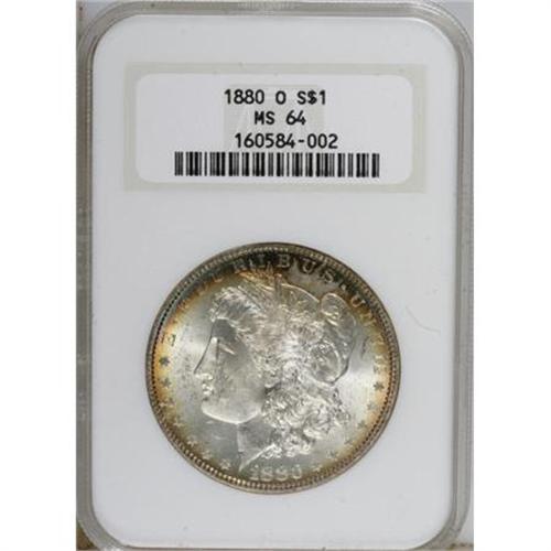 <B>1880-O $1 MS64 NGC.</B></I> Micro O. Honey-gold, orange, and powder-blue toning graces the peripheries of this lustrous near-Gem. Sharply struck and lustrous with few marks. Certified in a prior generation holder.<BR><BR><b>Shipping:</b> Coins & Currency (<a target="_blank" href="http://www.heritageauctions.com/common/shipping.php">view shipping information</a>)