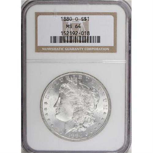 <B>1880-O $1 MS64 NGC.</B></I> Micro O. A lustrous and nearly brilliant near-Gem. Precisely struck and carefully preserved. This early New Orleans date is seldom seen any finer.<BR><BR><B>Coin Engraver:</B> George T. Morgan<BR><BR><b>Shipping:</b> Coins & Currency (<a target="_blank" href="http://www.heritageauctions.com/common/shipping.php">view shipping information</a>)