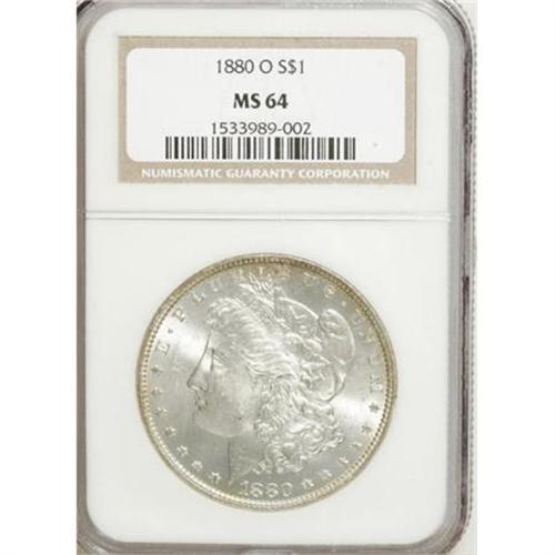 <B>1880-O $1 MS64 NGC.</B></I> Whispers of gold, orange, and rose patina grace the rims of this earlier O-mint piece, while the strongly lustrous centers are brilliant. Well-defined for the issue with light, scattered marks that account for the grade.<BR><BR><B>Coin Engraver:</B> George T. Morgan<BR><BR><b>Shipping:</b> Coins & Currency (<a target="_blank" href="http://www.heritageauctions.com/common/shipping.php">view shipping information</a>)