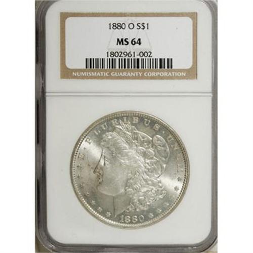 <B>1880-O $1 MS64 NGC.</B></I> Silver-gray surfaces yield pleasing luster, and an attentive strike imparts sharp definition to the design elements. Wisps of light tan-gold color appear in the left obverse field under magnification. Some minute marks limit the grade.<BR><BR><B>Coin Engraver:</B> George T. Morgan<BR><BR><b>Shipping:</b> Coins & Currency (<a target="_blank" href="http://www.heritageauctions.com/common/shipping.php">view shipping information</a>)
