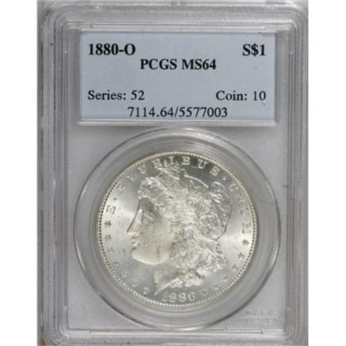 <B>1880-O $1 MS64 PCGS.</B></I> Micro O. A lustrous and close to brilliant near-Gem that has impressively unabraded fields and devices. Well struck for a New Orleans dollar, with pleasing sharpness on the claws and the hair above the ear.<BR><BR><B>Coin Engraver:</B> George T. Morgan<BR><BR><b>Shipping:</b> Coins & Currency (<a target="_blank" href="http://www.heritageauctions.com/common/shipping.php">view shipping information</a>)