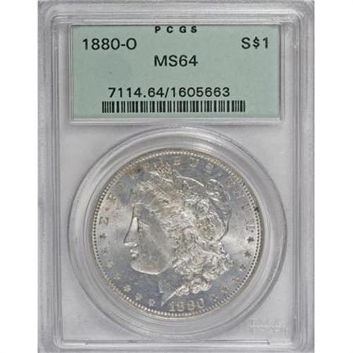 <B>1880-O $1 MS64 PCGS.</B></I> Micro O. Light streaks of chestnut toning endow this intricately struck and attractively preserved near-Gem. Certified in a green label holder.<BR><I>Ex: ANA Signature (Heritage, 8/97), lot 6951.</B></I><BR><BR><B>Coin Engraver:</B> George T. Morgan<BR><BR><b>Shipping:</b> Coins & Currency (<a target="_blank" href="http://www.heritageauctions.com/common/shipping.php">view shipping information</a>)