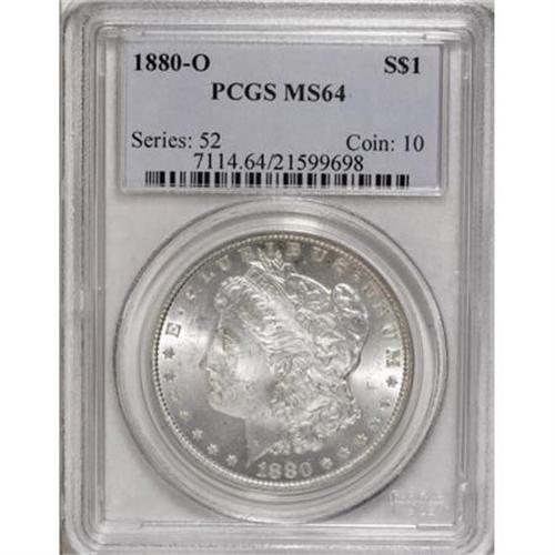 <B>1880-O $1 MS64 PCGS.</B></I> VAM-48. A Top 100 Variety. The popular "Hangnail" variety, not noted on the PCGS insert. This near-Gem is well struck and untoned, with an intense cartwheel sheen across both sides. Mild scuffiness on Liberty's cheek and scattered minor field marks define the grade. A great opportunity for the collector of Top 100 Morgan dollar VAMs.<BR><BR><B>Coin Engraver:</B> George T. Morgan<BR><BR><b>Shipping:</b> Coins & Currency (<a target="_blank" href="http://www.heritageauctions.com/common/shipping.php">view shipping information</a>)