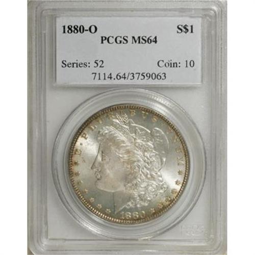 <B>1880-O $1 MS64 PCGS.</B></I> Excellent eye appeal for the grade with only light luster grazes on the cheek and attractive copper-gold patina near the legends. Highly elusive any finer, with only 20 such pieces certified by PCGS (1/08).<BR><BR><B>Coin Engraver:</B> George T. Morgan<BR><BR><b>Shipping:</b> Coins & Currency (<a target="_blank" href="http://www.heritageauctions.com/common/shipping.php">view shipping information</a>)