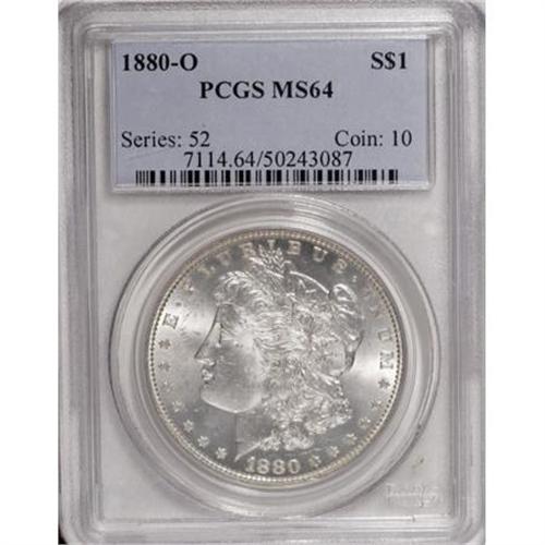 <B>1880-O $1 MS64 PCGS.</B></I> Shining luster and pleasing definition for this O-mint issue. A minimally toned and delightful Choice survivor. Highly elusive any finer, with only 21 such pieces graded by PCGS (1/08).<BR><I>From The Oxford Collection.</B></I><BR><BR><B>Coin Engraver:</B> George T. Morgan<BR><BR><b>Shipping:</b> Coins & Currency (<a target="_blank" href="http://www.heritageauctions.com/common/shipping.php">view shipping information</a>)