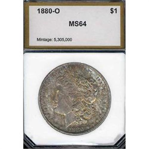 Heavy with streaky russet and gray toning from long residence in a coin envelope or old-style coin album. Coin is in PCI MS64 grading holder.