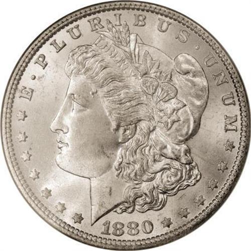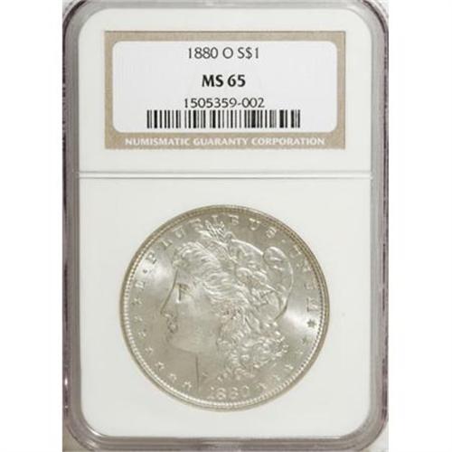 <B>1880-O $1 MS65 NGC.</B></I> Frosty and intensely lustrous, this Gem Morgan dollar is essentially untoned, although some faint rose accents can be discerned in the fields. Well struck on most design elements, the piece retains just a hint of typical New Orleans Mint softness on the hair detail just above Liberty's ear. The surfaces are generally well preserved, with a faint pinscratch noted in the lower left obverse field, and a couple of tiny marks observed on the eagle, with magnification. This is a conditionally rare issue for Gems, with a mere 39 pieces so graded by NGC and PCGS combined, and<I> </B></I>none finer! <BR><BR><B>Coin Engraver:</B> George T. Morgan<BR><BR><b>Shipping:</b> Coins & Currency (<a target="_blank" href="http://www.heritageauctions.com/common/shipping.php">view shipping information</a>\)