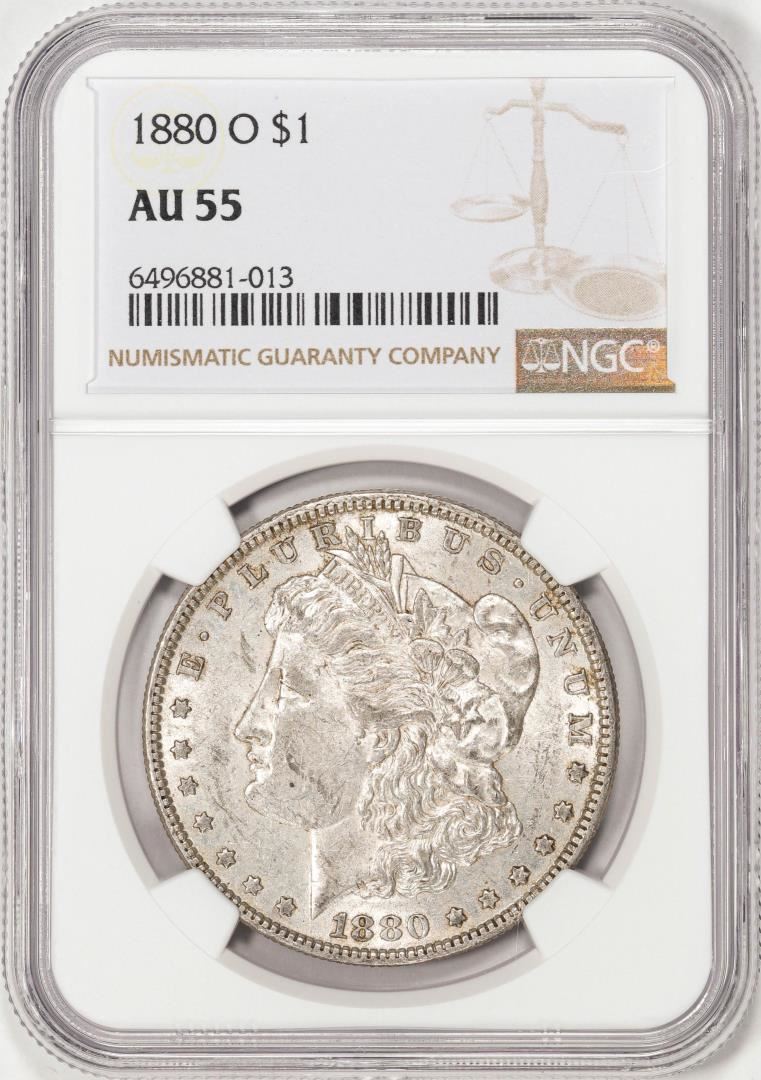 One 1880-O $1 Morgan Silver Dollar Coin NGC AU55. NGC Certified.