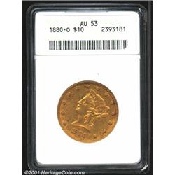 1880-O $10 AU53 ANACS.<p>Among O-mint eagles, this underrated issue is easily as scarce as the 1850-O, 1860-O, 1881-O, and 1882-O. This partially lustrous, orange-gold coin is boldly defined despite light wear across the highest points.From the Robert Knowles Collection. Important notice: We expect to be auctioning lots at the rate of 200-250 per hour. Sometimes eBay Premier live bid software cannot keep up with that pace, so we strongly recommend that you place a realistic proxy bid now as insurance to avoid disappointment. Also please note that all Heritage/CAA lots purchased through eBay Premier carry a 20% Buyer's Premium.
