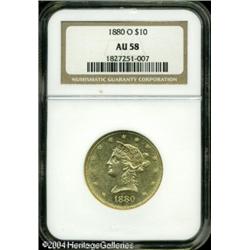 1880-O $10 AU58 NGC. Sharply struck with pleasing <B>1880-O $10 AU58 NGC.</B></I> Sharply struck with pleasing luster, but moderately abraded. The stars are die doubled, and the lower reverse legends are lightly strike doubled, as is often the case with this issue. The New Orleans mint produced just Morgan Dollars and Liberty Eagles in 1880. Only 9,200 pieces were struck. <BR><BR><B>Important notice:</B> Heritage usually auctions material at the rate of 200-250 lots per hour. On some occasions eBay Live bid software or the Internet may not be able to keep up with the pace of the auction. We recommend placing a realistic absentee bid now as insurance to avoid disappointment. Occasionally the auctioneer may eliminate or reject an eBay Live bid, and the auctioneer may also reopen a lot after the close of the eBay live bidding (usually because we missed an audience bid), and may reject your bid even if it shows you as the winning bidder. By bidding via eBay Live, you agree that Heritage may award the lot to another bidder at its sole discretion under the circumstances described above or any other reasonable circumstances. Since eBay bids are not shown to us until we open the lot on the floor, we treat those bids just like floor bids. In most cases the floor responds before the eBay bid is presented to us, due to Internet lag time, so for consistency we have made it a policy that floor bids are always considered first over tie eBay live bids. Also please note that all Heritage lots purchased through eBay Live carry a 20% Buyer's Premium. Please make sure you read the Terms and Conditions before you bid. This lot is being auctioned in conjunction with a live floor auction by Heritage Galleries & Auctioneers. All final auction and invoice information will be supplied by Heritage Galleries & Auctioneers, and all other information should be considered preliminary. Lot:6753