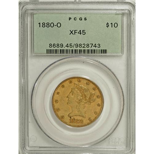 <B>1880-O $10 XF45 PCGS.</B></I> An orange-gold Choice XF example that displays pleasing detail overall and modest wear on the devices. Two parallel grease stains affect the first two digits of the date, and the lower stars display a touch of softness. This post-war issue amounted to just 9,200 pieces, and few could afford to save examples. Population: 18 in 45, 63 finer (3/07).<BR><BR><b>Shipping:</b> Coins & Currency (<a target="_blank" href="http://www.heritageauctions.com/common/shipping.php">view shipping information</a>)