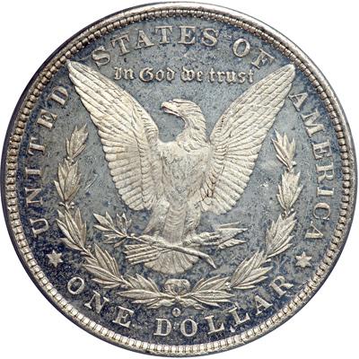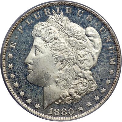1880-O Morgan Dollar. PCGS graded MS-64 Deep Mirror Prooflike. Light grey in color with excellent contrast. A blazing beauty of a deep mirror O-mint coin! The satiny devices are alight with bright volatile frosted luster that looks as though it would like nothing better than to explode with a loud bang. Against this reside smooth mirrors that are almost devoid of marks. Well struck for the date, as well, and easily matching or surpassing the few others in this remarkable grade. (For the most part, 1880-O silver dollars were struck from lustrous, not prooflike dies. We can only suppose this is an early strike from new dies, which tend to be prooflike for the first 50 or 100 impressions before leaving the reflective quality behind.) Pop 40; 1 better in 65 DMPL (PCGS # 97115) .